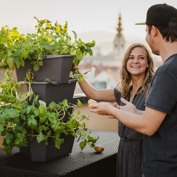 Thanks to several levels that can be stacked on top of each other, the same amount of potatoes can be grown on an area of 0.2m² in PAUL POTATO as on 2m² in the classic ground-level bed. The best thing about it: thanks to its size, PAUL POTATO fits perfectly on the balcony, terrace or in the garden.