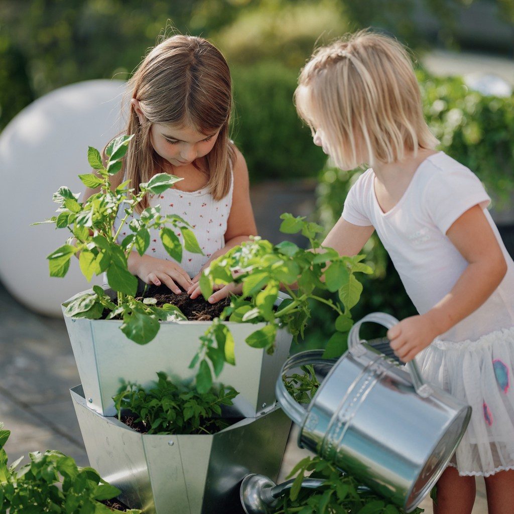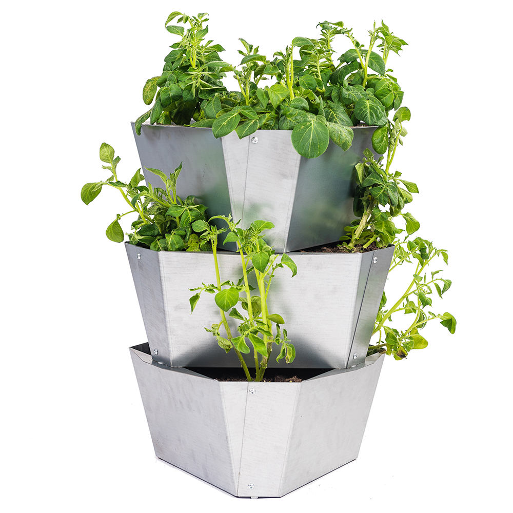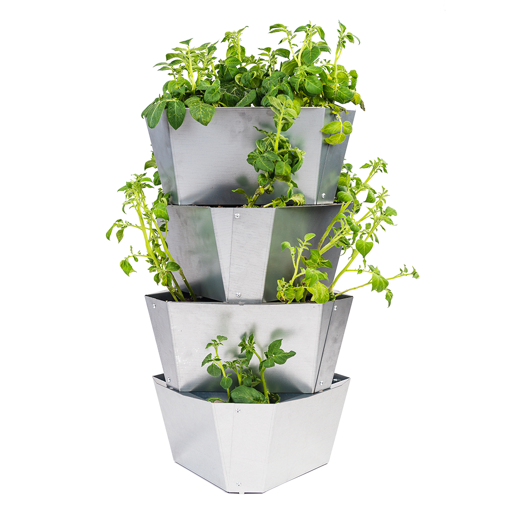 Setting up PAUL POTATO is quick and easy. Fill each level with soil and place a seed potato in each corner. The individual levels are then simply placed on top of each other.