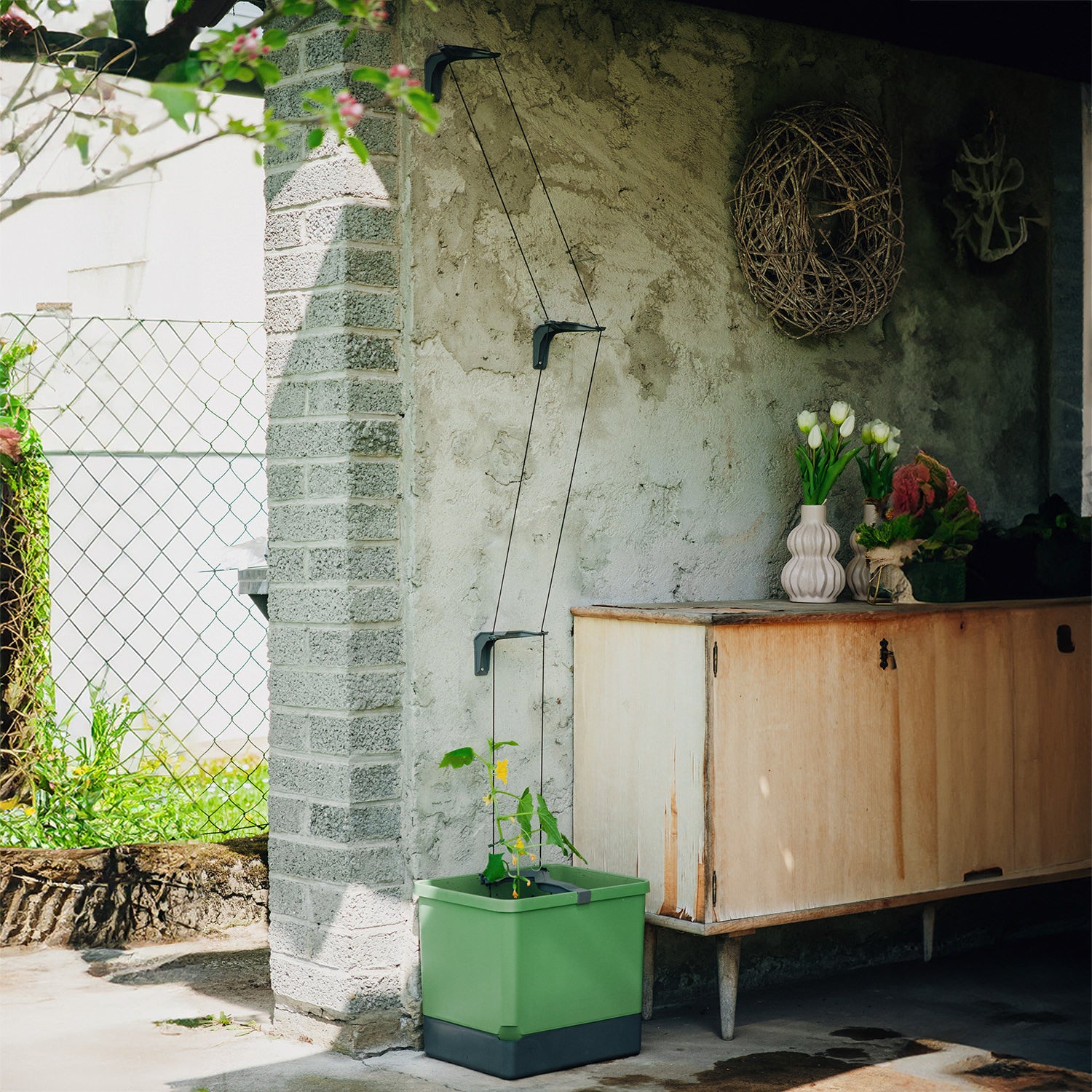 Die Rankhilfe von CURT CUCUMBER kann flexibel an der Wand montiert werden die Pflanze kann entlang der Bänder nach oben Ranken. (Schrauben und Dübel sind im Lieferumfang enthalten)