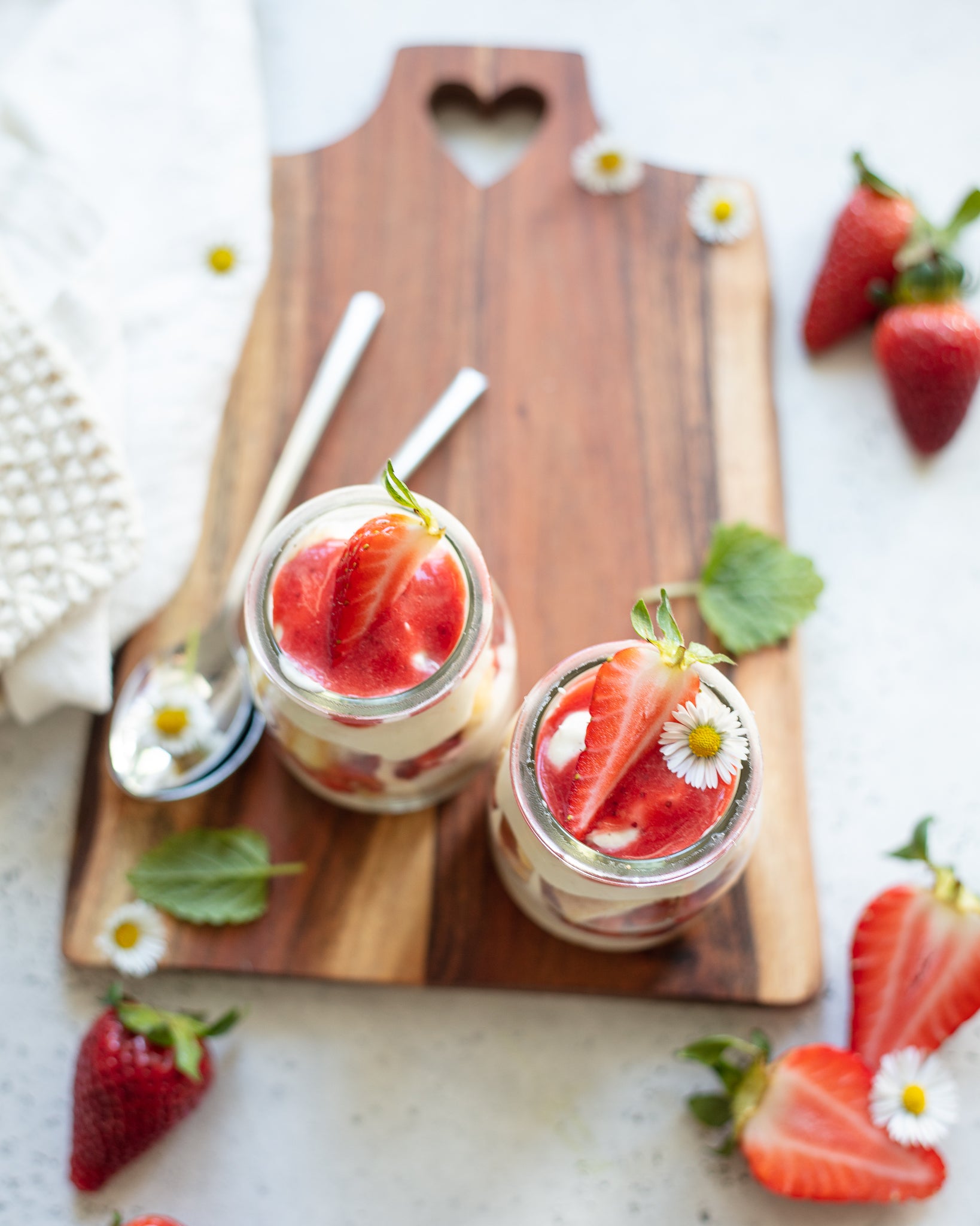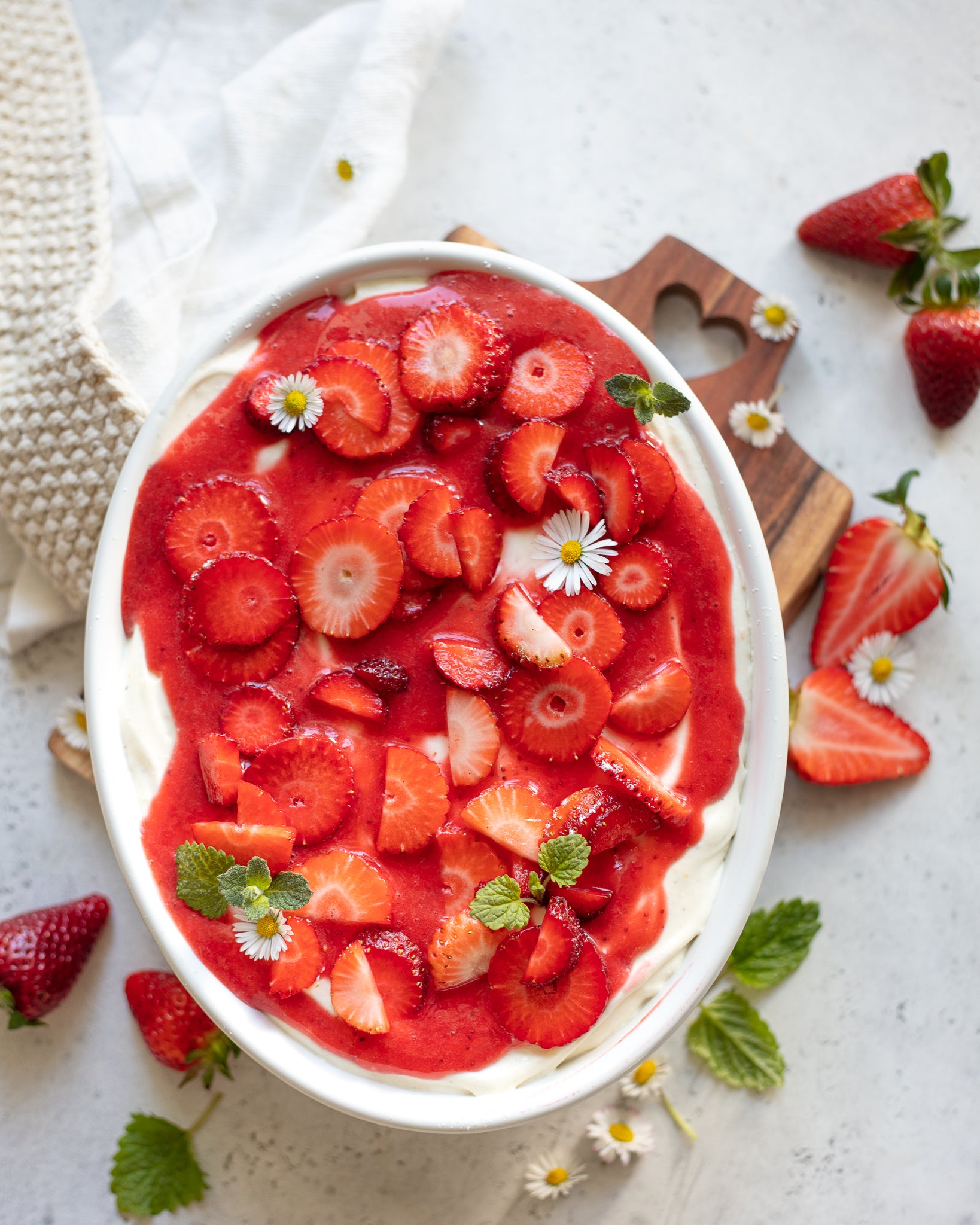 Ein Tiramisù ist ein wunderbar cremiges Dessert. Manchmal passt aber kein Alkohol zu den Gästen, oder der Kaffee wird nicht gewünscht, also ist der klassische italienische Dessertliebling nicht jedermanns Sache. Hier aber trifft Creme auf Erdbeeren und Orangennote… köstlich und auch für die Kinder eine tolle Nachspeise!