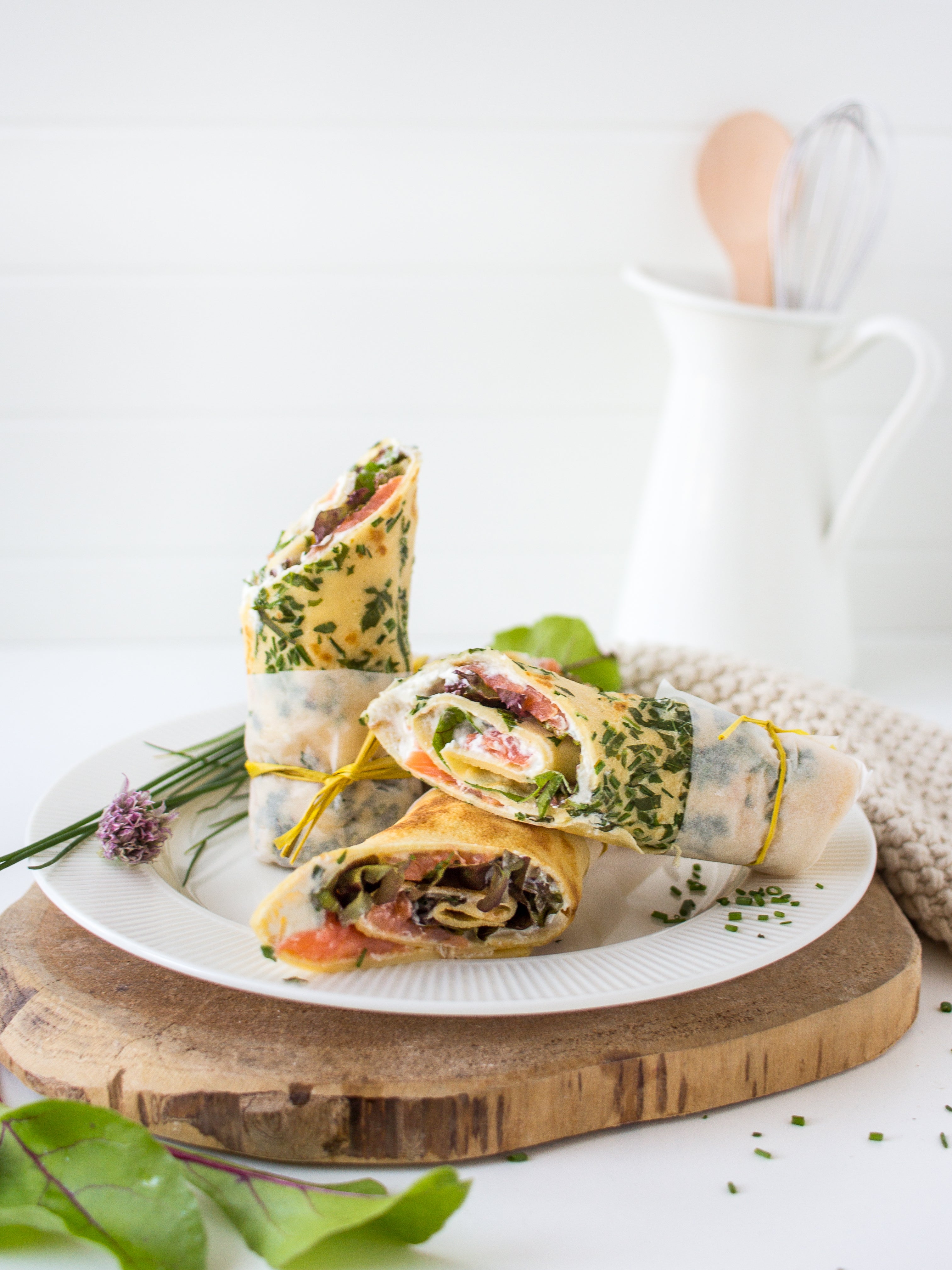 Die fertigen Palatschinken (Wraps) mit der Füllung bestreichen. Zupfsalat oder noch mehr frische Kräuter darüber verteilen, mit ein paar Gurkenscheiben und zuletzt mit dem Räucherfisch belegen. Die Palatschinke links und rechts ca. 3cm einschlagen und von unten einrollen. (So fällt später nichts aus dem Wrap heraus.) Mit einem schrägen Schnitt die Rolle halbieren. Aufgestellt oder übereinander gelegt am Teller anrichten – reinbeißen und genießen!