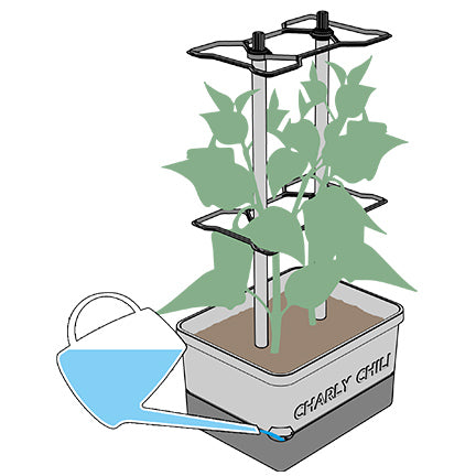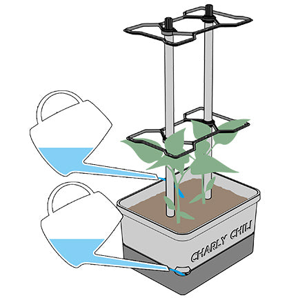 After planting, water your chili plants from above for a while and also fill the tank with 4.5 liters of water. Once the roots reach into the water tank, all you have to do is refill the tank regularly.