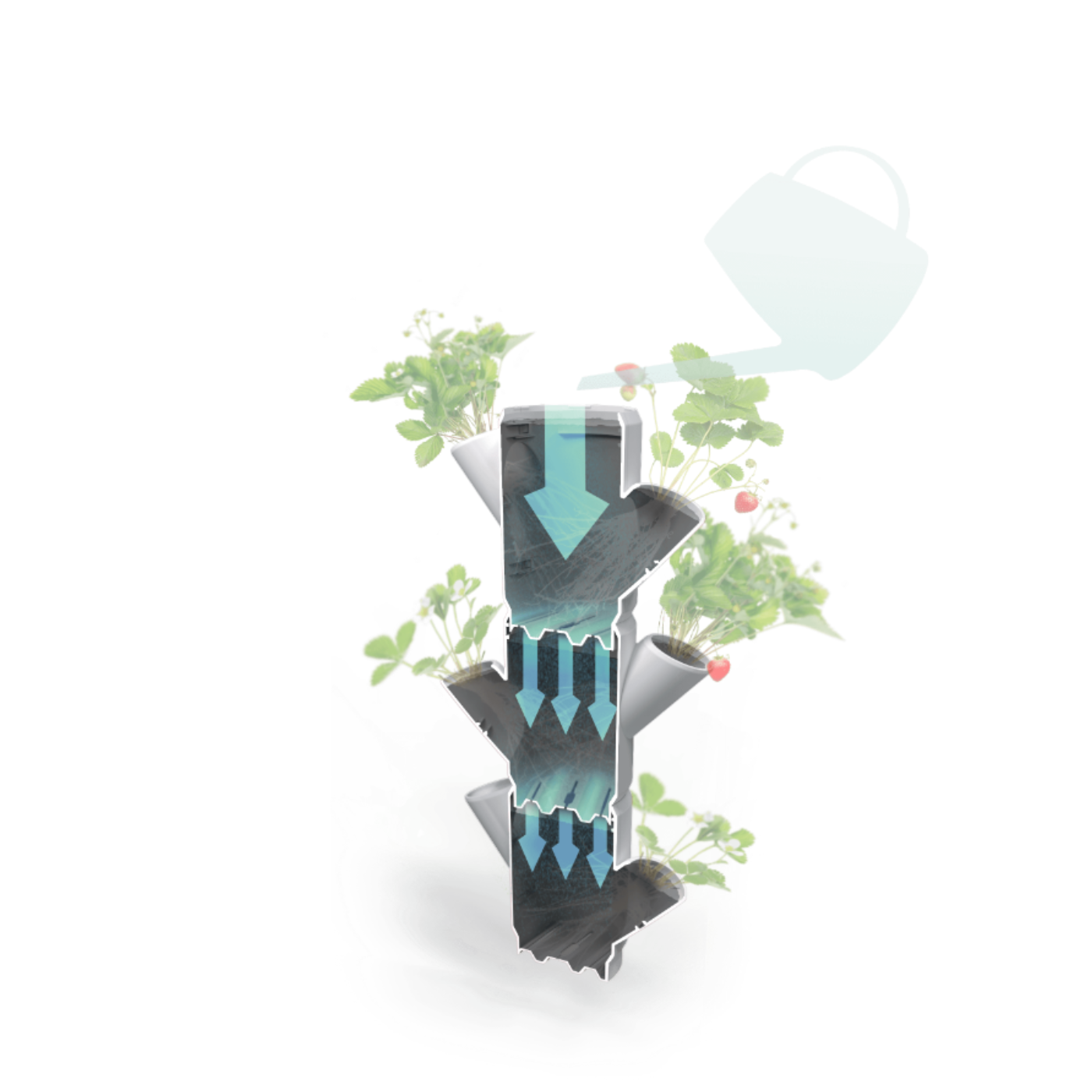 Saves water and time: the integrated water control system from SISSI STRAWBERRY guarantees perfect watering of all plants on every floor. Simply pour water into the top layer and the water will automatically distribute evenly throughout the strawberry tree.